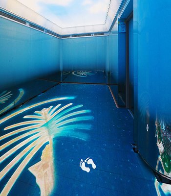 The View at the Palm experience begins at the roof plaza of Nakheel Mall as the Palm Tower is connected to it. Before you board the elevator, check out the View Exhibition, designed to honor the Palm Jumeirah’s unmatched vision and ingenuity. Pass through the fascinating aquarium tunnels and be in awe at the immersive floor mapping that sheds light on the origin and history of this legendary man-made island.
